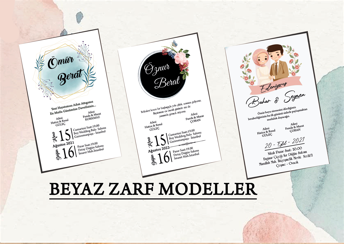 Düğün davetiyeleri, nişan davetiyeleri, sünnet davetiyeleri yada diğer etkinlikleriniz için çeşitli davetiyeler ile sevdiklerinize değer verdiğinizi hissettirebilirsiniz.