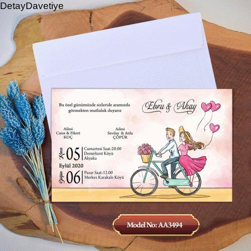 Türkiye’nin Her Bölgesine Ücretsiz Kargo Kapıda Ödeme İmkanı Davetiye modellerimiz 230 gram Amerikan Bristol kağıda basılmaktadır. Davetiyeler kesinlikle ince ve kalitesiz kağıtlardan oluşmamaktadır. Sadece birbirine bağlama işciliği müşteri tarafından ele alınmaktadır. Kartpostal ve tebrik kartlarıyla aynı kağıda basılmaktadır. Davetiye ebatı 16x10 cm\'dir. Detay Davetiye olarak sizlere bu modeli yüksek kalite güvencesiyle sunuyoruz. Ücretsiz kargo ve kapıda ödeme fırsatı ile sizlere hizmet sunuyoruz