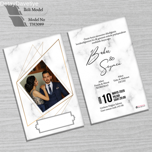Türkiye’nin Her Bölgesine Ücretsiz Kargo Kapıda Ödeme İmkanı Davetiye modellerimiz 230 gram Amerikan Bristol kağıda basılmaktadır. Davetiyeler kesinlikle ince ve kalitesiz kağıtlardan oluşmamaktadır. Sadece birbirine bağlama işciliği müşteri tarafından ele alınmaktadır. Kartpostal ve tebrik kartlarıyla aynı kağıda basılmaktadır. Davetiye ebatı 16x10 cm'dir. Detay Davetiye olarak sizlere bu modeli yüksek kalite güvencesiyle sunuyoruz. Ücretsiz kargo ve kapıda ödeme fırsatı ile sizlere hizmet sunuyoruz